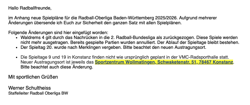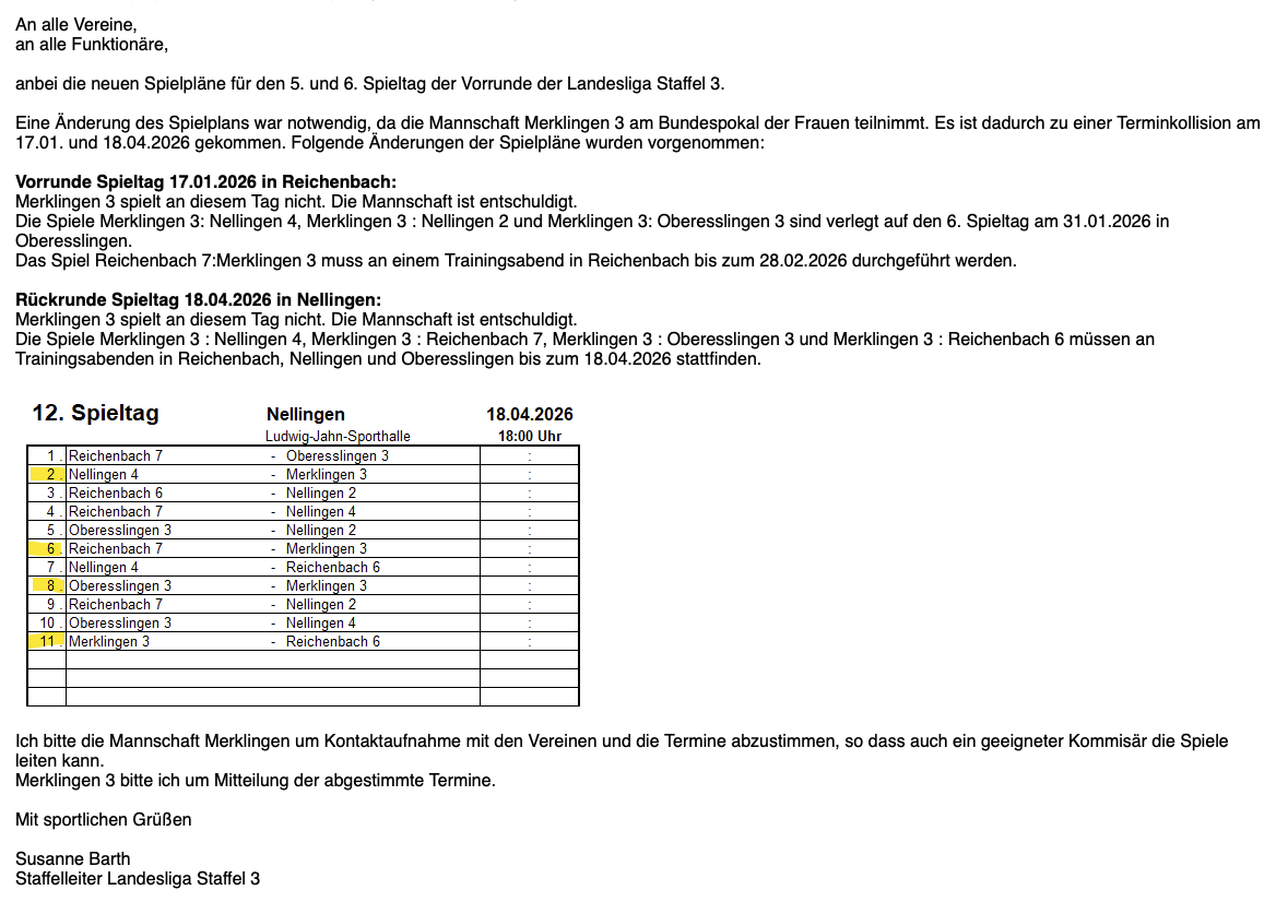| 06.09.25 | VBL – Staffel I | Update verfügbar: Aktualisierte Unterlagen Kurzinfo: Umbesetzung der Mannschaft Konstanz II |