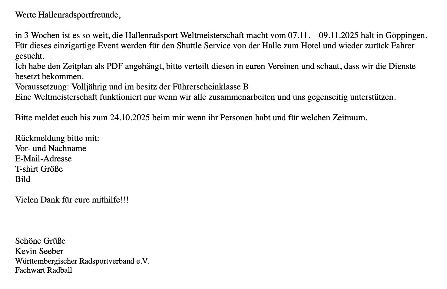 | 11.09.25 | Informationen Saison 2025/26 | Informationen und wichtige Hinweise - Kevin Seeber, Fachwart Radball WRSV - Wichtige Hinweise - Regelungen - Ordnungsstrafen - Jahreskalender - Beispiel Spielberichtsbogen |