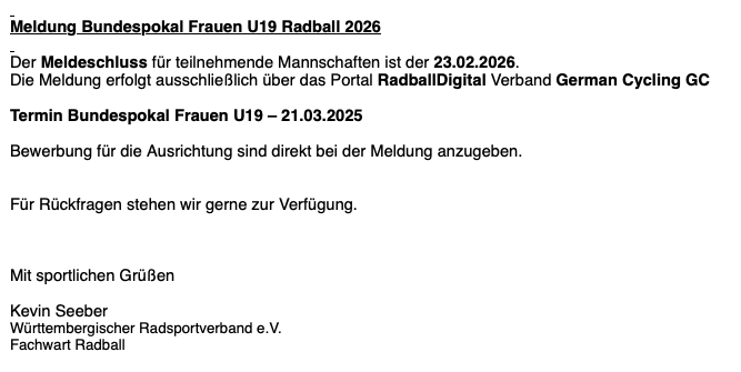 Ausschreibung | Radball-Verbandsrunde 2026 U11 (Schüler C) - Info Meldeschluss: 30.November 2025 |