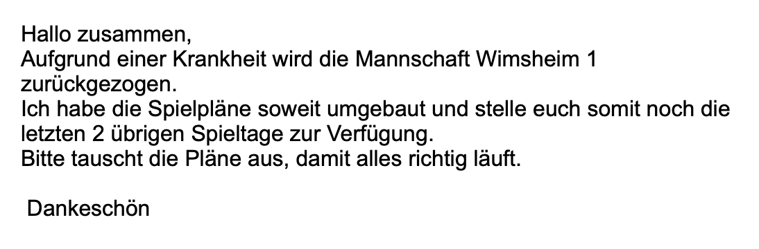 BZL - Staffel II | Übernahme des Heimspieltags von Reichenbach am 15.11.2025. Wer hat Interesse den Spieltag zu übernehmen? Bitte um zügige Rückmeldung an Harald Laib (0174 2027809, bzl2[ät]laibs[dot]de) |