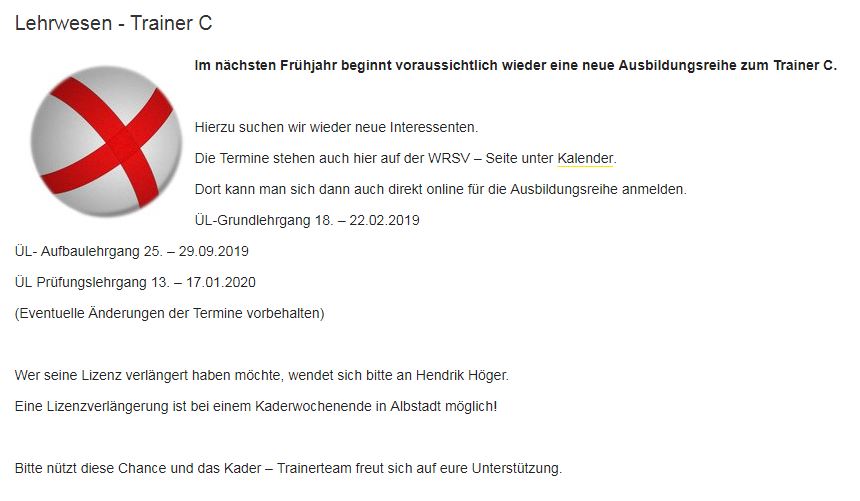 17.07.18 | Trainer C | Anfang 2019 gibt es voraussichtlich wieder einen neuen Trainer C-Lehrgang. Infos auch zur Lizenzverlängerung sind abrufbar. |