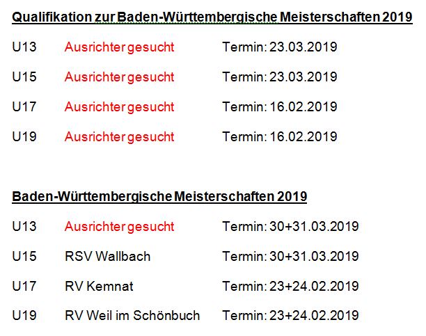 31.03.19 | Gratulation an die neuen BW-Meister aus Wallbach (U13) und Gärtringen (U15). Die Ergebnisse sind hinterlegt. |