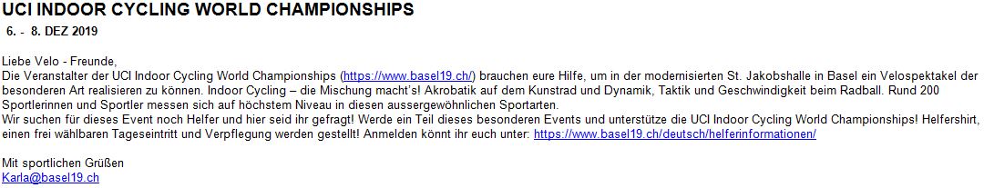 Die Veranstalter der Hallenradsport WM 2019 in Basel suchen noch weitere Helfer für die Durchführung. Hier erste Infos hier oder über die Internetseite.