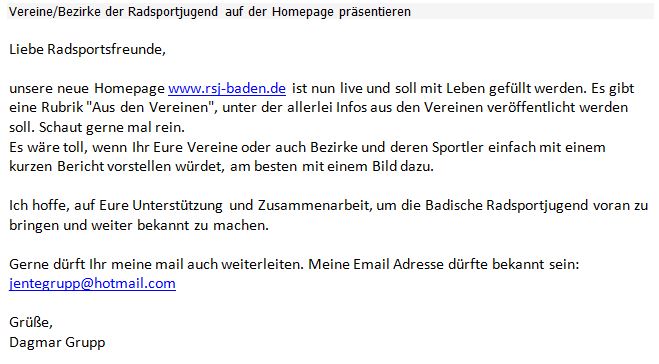 07.07.18 | Adressprüfung | Ich bitte alle Vereine Ihre Adressangaben die hier hinterlegt sind zu prüfen u. falls nötig mir die Korrekturen mitzuteilen. Vielen Dank. |