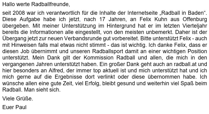 Tagung | Tagung radballtreibender Vereine des SSB, BRV und WRSV Sonntag, 13.07.2025 (10 Uhr), in 71409 Schwaikheim (Radsporthalle, Badstraße) Vorläufige Tagesordnung - Anwesenheitspflicht! |