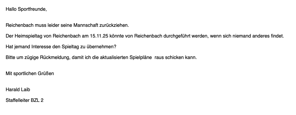 BZL - Staffel II | Übernahme des Heimspieltags von Reichenbach am 15.11.2025. Wer hat Interesse den Spieltag zu übernehmen? Bitte um zügige Rückmeldung an Harald Laib (0174 2027809, bzl2[ät]laibs[dot]de) |