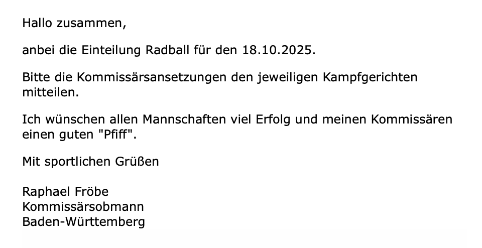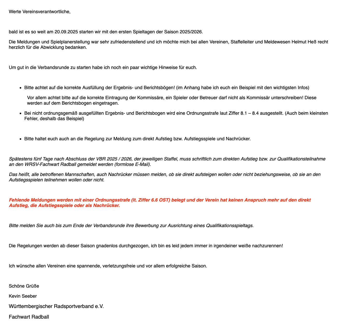 11.09.25 | Informationen Saison 2025/26 | Informationen und wichtige Hinweise - Kevin Seeber, Fachwart Radball WRSV - Wichtige Hinweise - Regelungen - Ordnungsstrafen - Jahreskalender - Beispiel Spielberichtsbogen |